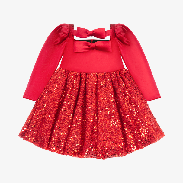 Our exquisite velvet dress with sequins and a double bow, is a perfect choice for your little fashionista who loves to sparkle. The bows are positioned strategically to create a visually appealing and stylish look. They add a touch of playfulness and sophistication to the dress. This dress is perfect for special occasions, and will make a stylish statement.
